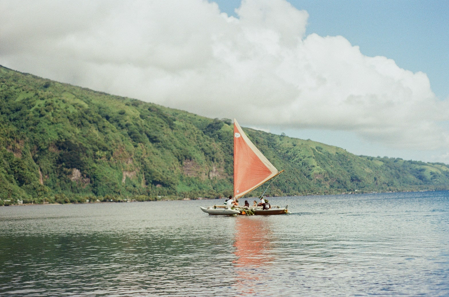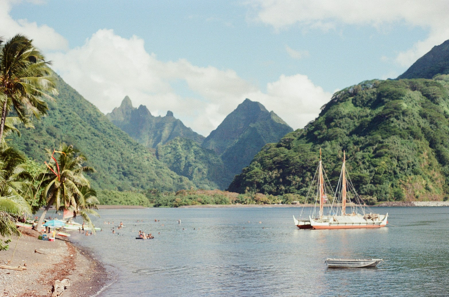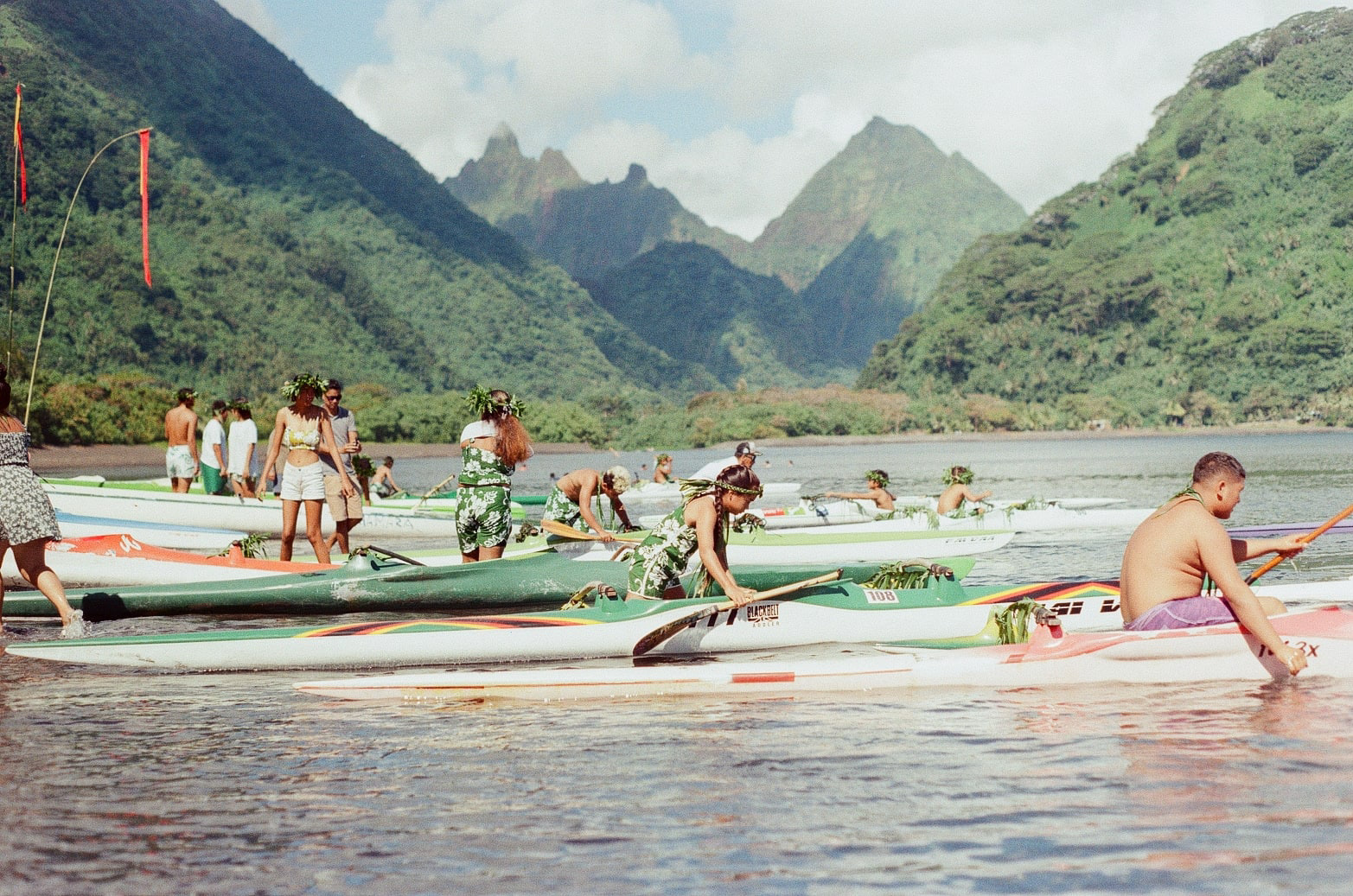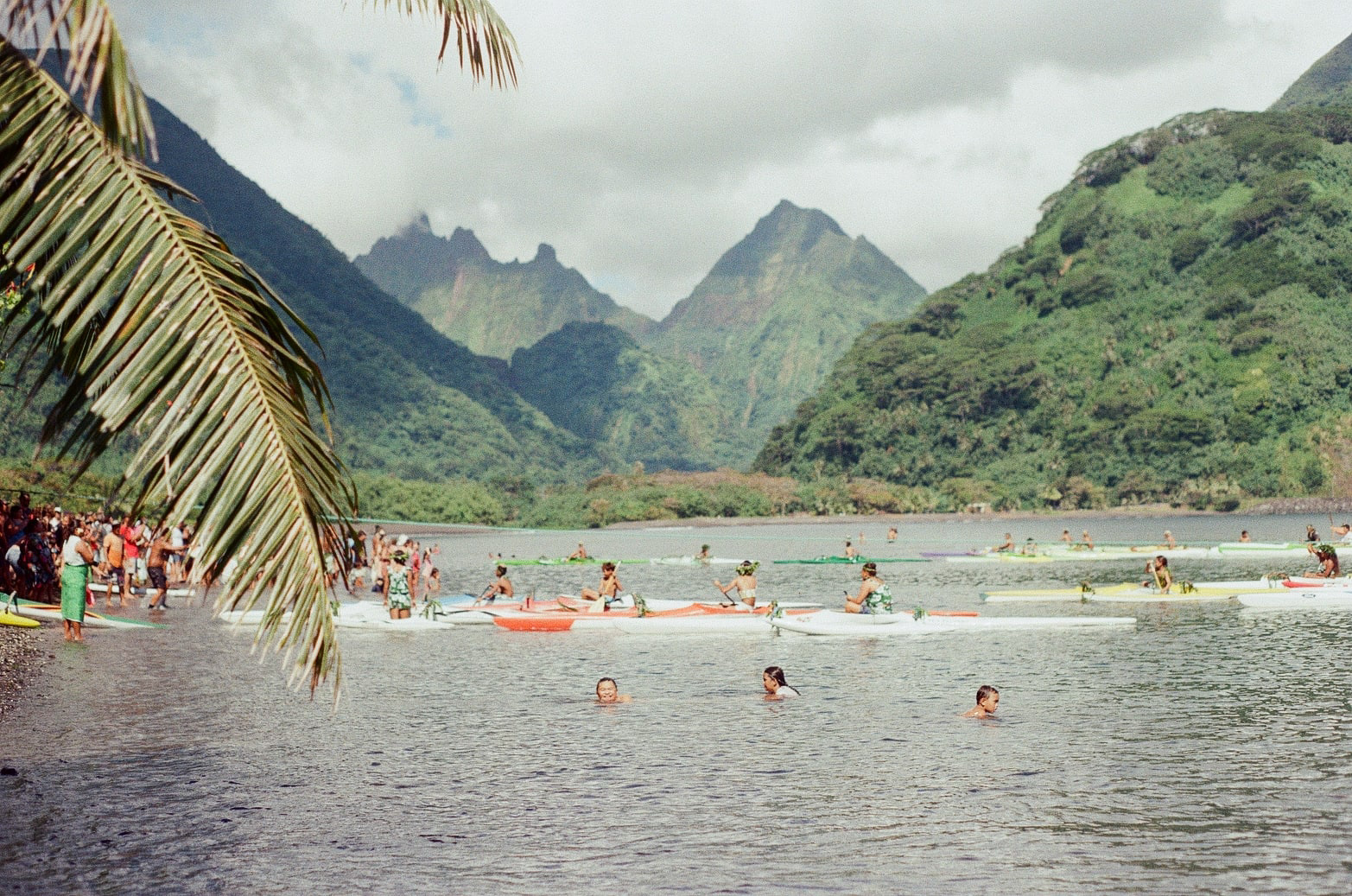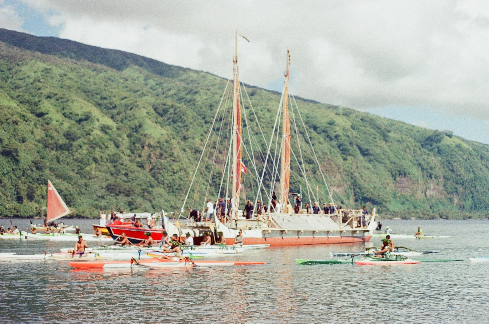 Accueil des pirogues doubles Hōkūle’a et Hikianalia le 28 juillet 2025 à Tautira, sur la presqu'île de Tahiti.